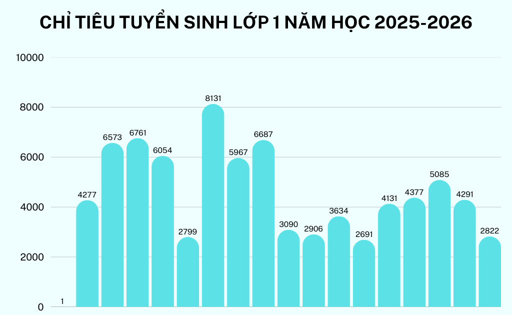 Theo biểu đồ trên, một số quận/huyện có tổng số chỉ tiêu tuyển sinh vào lớp 1 năm học 2025-2026 trên dưới 6.000 chỉ tiêu như: Bắc Từ Liêm, Cầu Giấy, Chương Mỹ, Long Biên.